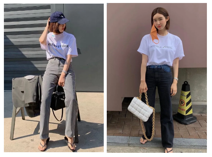 可别小看区区一个棒球帽,作为头顶装饰,它最容易让人一眼看见。See,同样的T恤+牛仔裤+人字拖,左边多个棒球帽,就是更原汁原味的“韩国味”了。