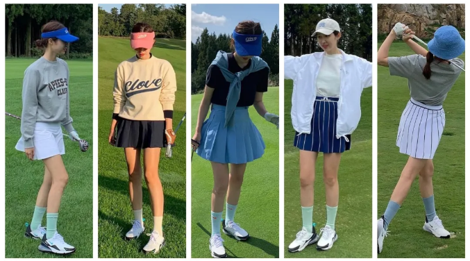 车贞媛平时有个爱好是打高尔夫,你们看她的打球装备,同样的紧身T+小短裙,但她用上了大面积的白+天空蓝、白+豆沙绿、白+少女粉…韩国味儿就很浓:
