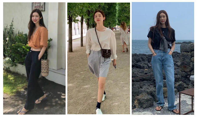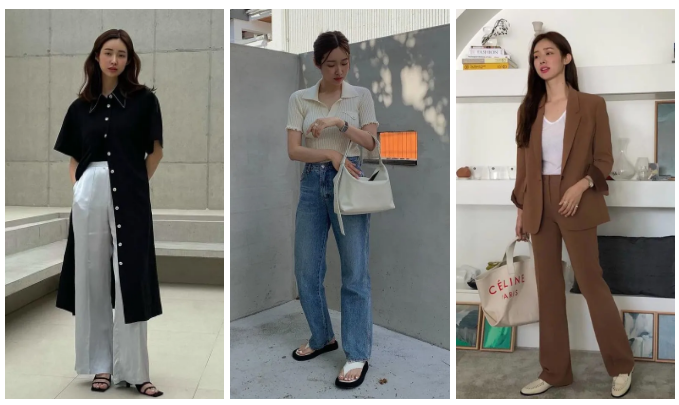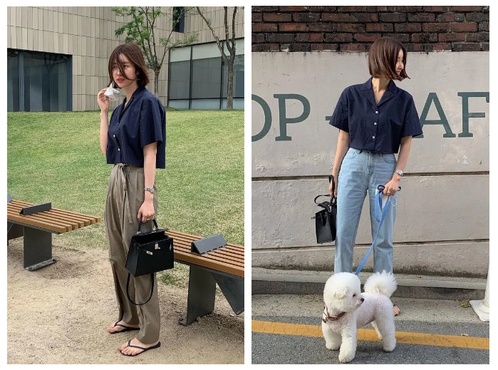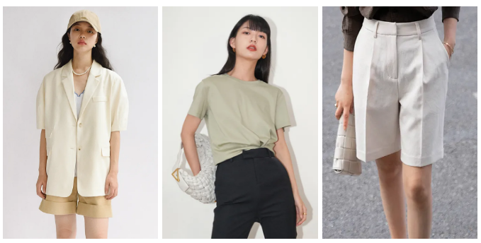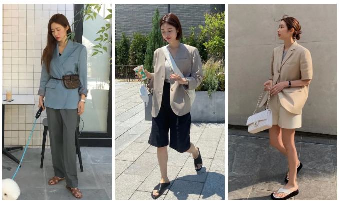 比如搭配了西裤,那就踩双平底拖鞋;或者干脆裁短裤长,变成更随性的百慕大短裤。不会显得太追求大气场而用力过猛,非常适合亚洲女孩借鉴: