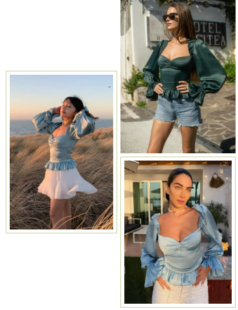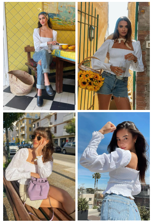 法国品牌La Semaine Paris的上衣,有不少人穿。下面这件方领口泡泡袖,有点仙。Juny、Gabrielle Caunesil、juliesfi和模特Kelsey Merritt的春夏穿法