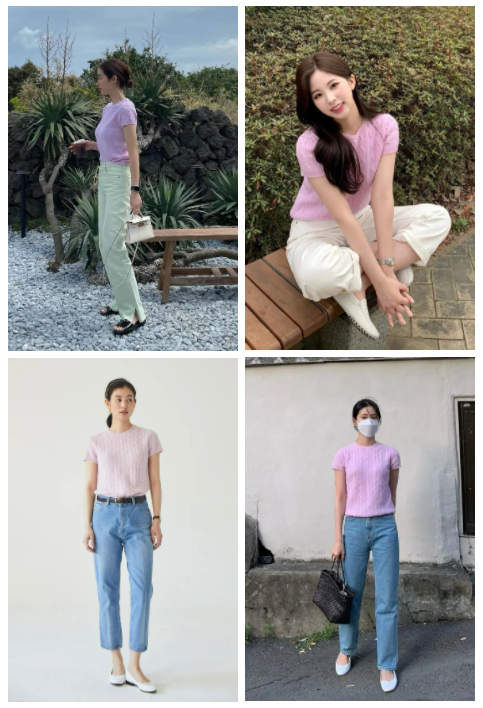 车静媛和立花惠理都穿过的这件紫色针织短袖来自Urbanic 30,材质是很柔软的羊绒。有白色和粉色两种颜色,官网1400元到手。下半身也很简单,一条直筒裤就能出门。