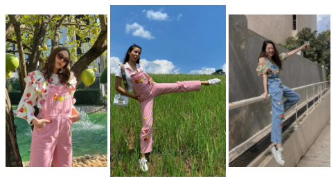 这条减龄的Sretsis背带裤,香波和yaya都穿了粉色的,而pimmy选了牛仔款,来了一个清新的蓝配绿。