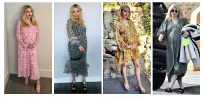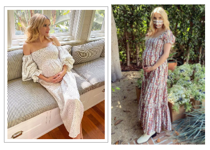 如果穿大袍子实在担心不显比例呢,那还有高腰设计的大袍子也可以考虑一下。比如艾玛罗就穿过很多胸上是弹力松紧的印花裙,很适合小个子孕妈。
