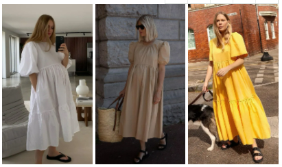 或是分隔线设计在胸下的款式,下摆很大,对腹部没有任何压力。瑞士博主Elvira Legrand在孕期穿了很多这种款: