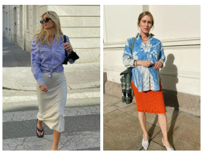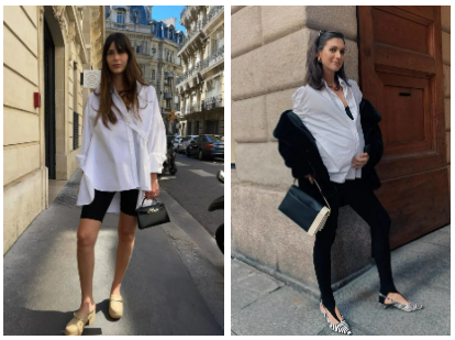 喜欢穿半裙的孕妈妈要抓紧啦,肚子不过分大时刚好穿!巴黎博主Anne-Laure Mais和挪威买手Annabel Rosendahl都穿上了弹力半裙,搭配衬衫。