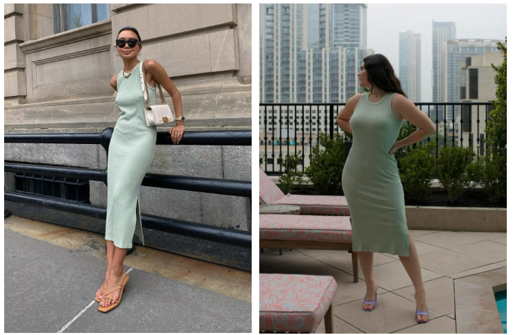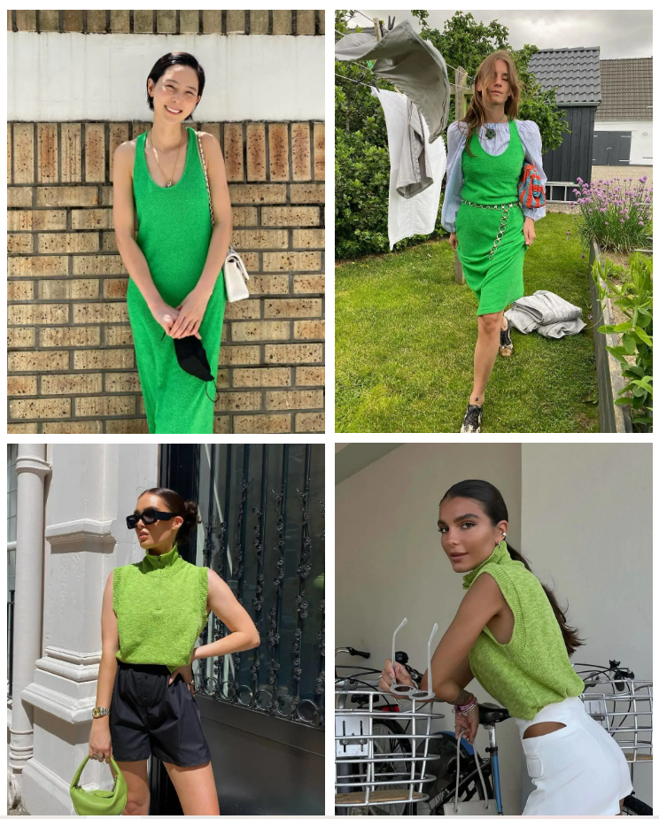 下面这件绿色无袖裙,金娜英和Kathrine贡献了都市丽人和潮流女孩的不同穿法。而Alicia和Marie Cher的高领针织背心,看着也好适合在空调房穿哈哈。