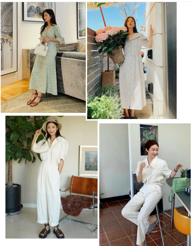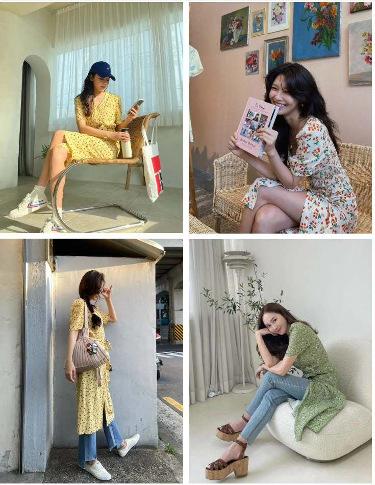 Rouje的裙子,从明星到博主,出现的次数不要太多~秀英就穿了好几次,棒球帽+碎花裙+小白鞋的万能公式推荐给大家。