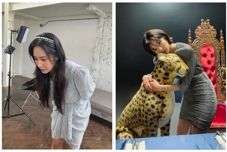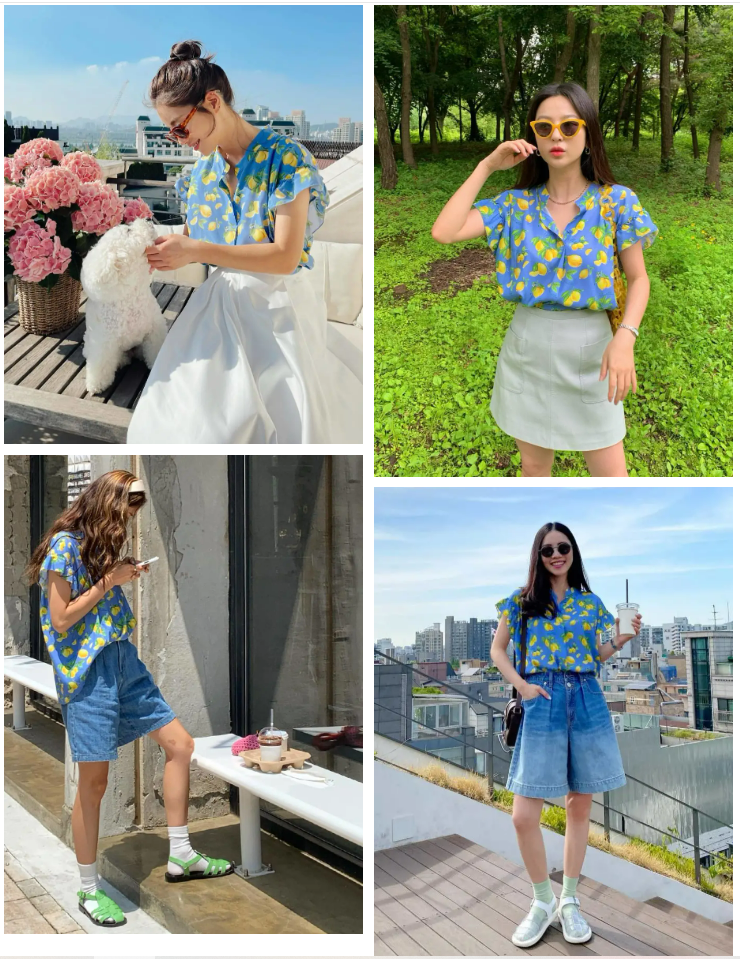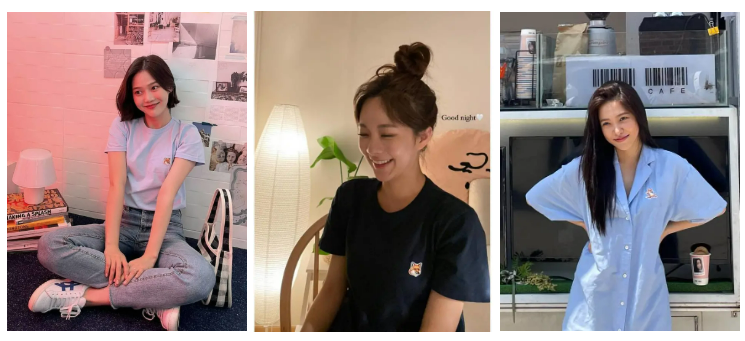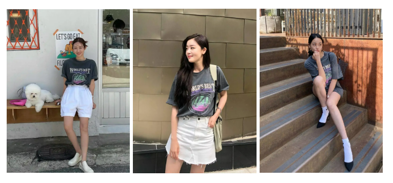 韩国女生很喜欢圆领T。Raive的灰色T,偏oversized,胸前有图案。像车静媛和韩善花一样,下面穿个简单的白短裤或白裙就可以出门。李珠妍则凹了个造型,大胆的女生也可以试试。