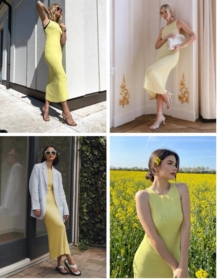 Viky身上的这条Edited的鹅黄色紧身裙,特别上镜,为它打call的人也不少。利用率看着还挺高的,春秋在外面披一件西装外套也可。