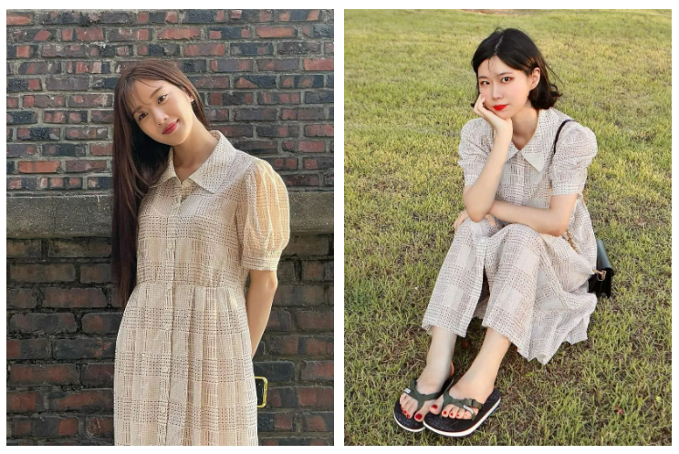 再来介绍两个韩国品牌。韩剧里经常出现的ON&ON,不少女明星私下也爱穿。她们的整体风格挺文艺淑女的。文佳煐最新的照片里穿的这条微微镂空的衬衫裙,颜色可温柔了。
