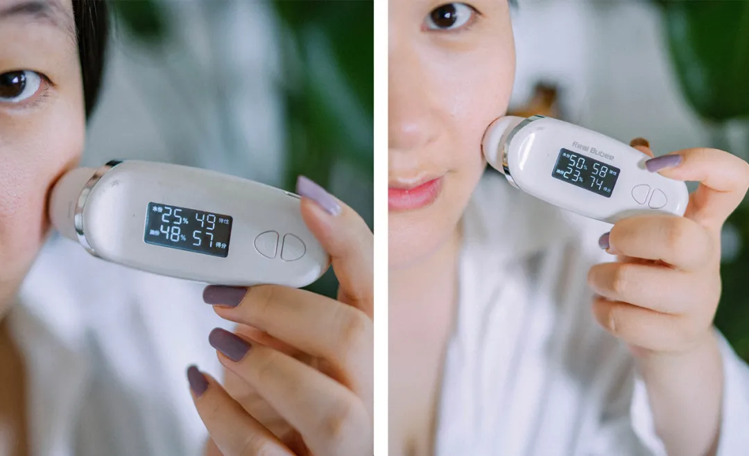 可以看出使用后的皮肤含水量是使用前的两倍,弹性增加,油分反而减少。这是我用完1h后的对比,比起其他护肤品算保持得不错。