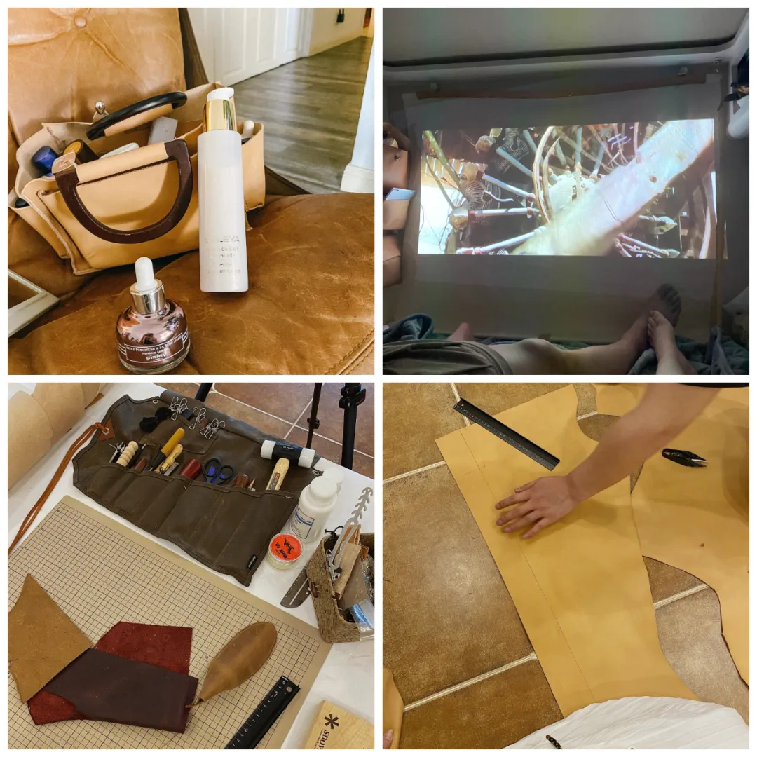 我还跟老王学着用废旧皮料做了点手工皮具,环保且过程有趣。这个小收纳化妆包就是本人限量手作~包括投影布也是我们亲自动手的!!