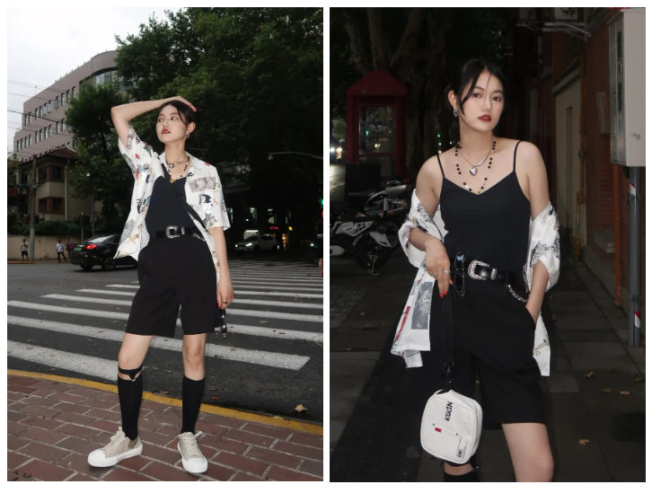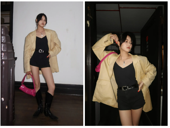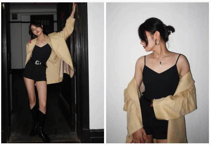 吊带、西装、短裤的套路不变,all black的吊带+热裤组合就是酷女孩的最爱。