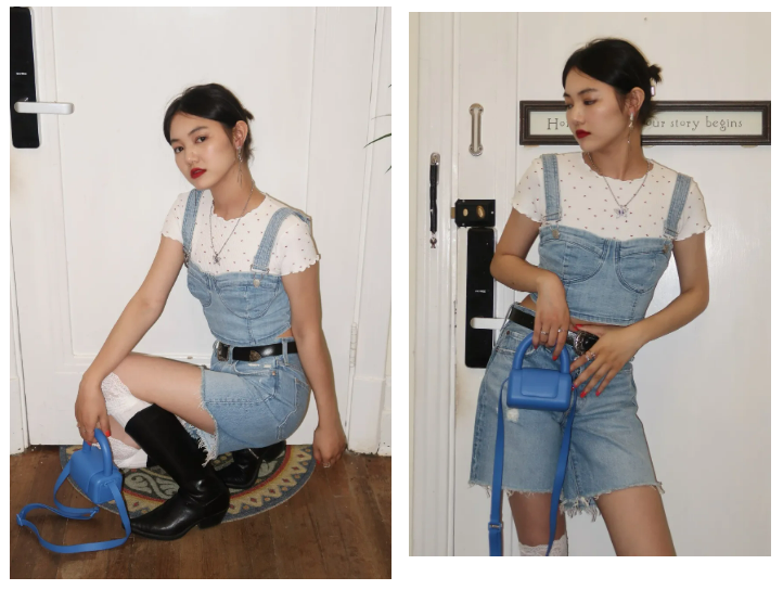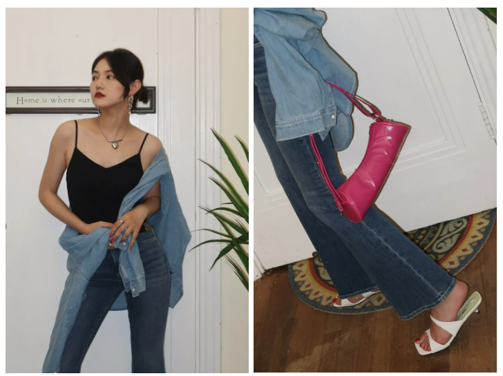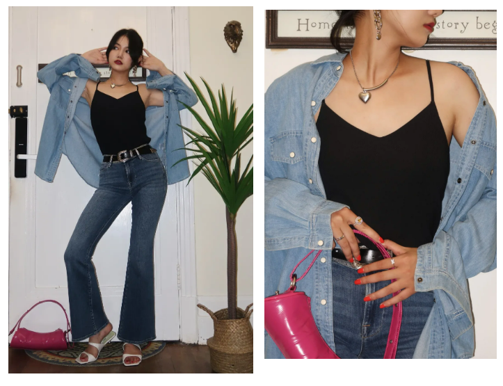 Denim本身就很随性,但想要加一点复古辣妹的feel~就从选品开始改变,吊带、喇叭裤、亮粉腋下包都在为辣妹注入灵魂,整体看下来更有复古港风。