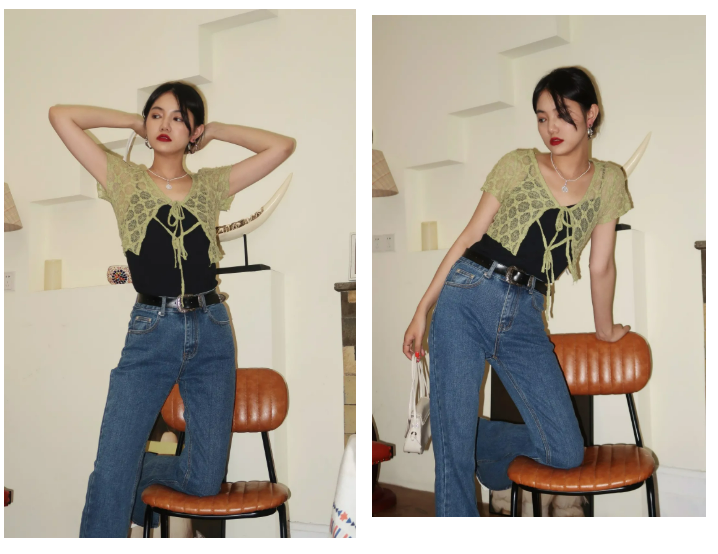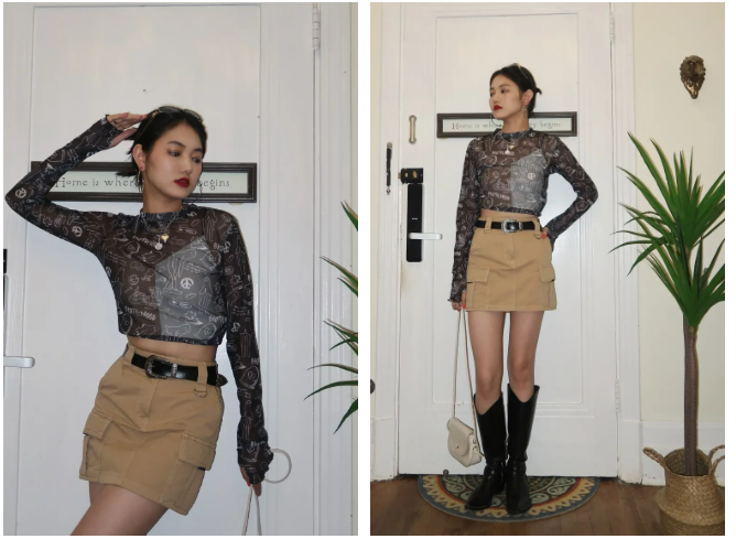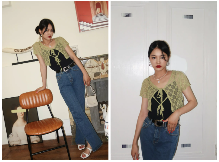 咸菜绿的罩衫作为亮点,用喇叭裤加重复古感,这里如果将吊带叠短更会有一点辣妹风,有小肚子的就直接收好肉肉,黑色显瘦也不易被察觉。