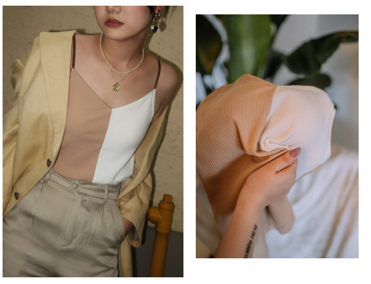 炎炎夏日当然要入手一件颜色清浅的吊带,我选了这件驼+白拼色,在忙碌的工作日,给视觉降温的同时,也让你的上班look避免全纯色单品组合的单调。