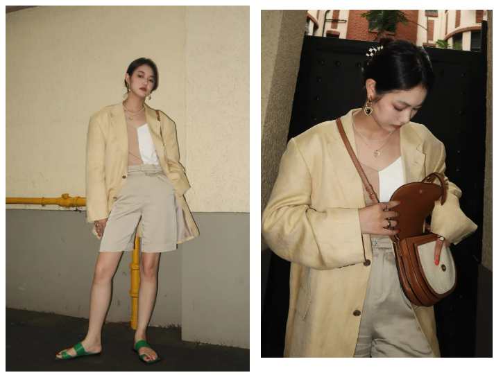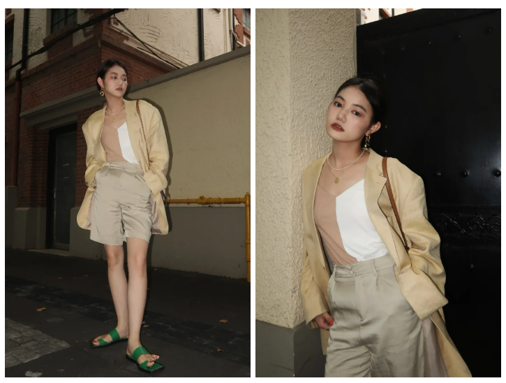 搭配以拼色内搭为颜色主基调,选择同样浅色系的单品,鹅黄西装+浅绿西装短裤保持了整体的清爽。