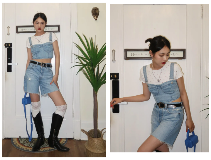 这一套,想要打造甜酷感,5分牛仔短裤和高筒尖头靴(尤其是尖头靴)加持酷感,甜就交给了bm女孩必备的短T和蕾丝高筒袜。