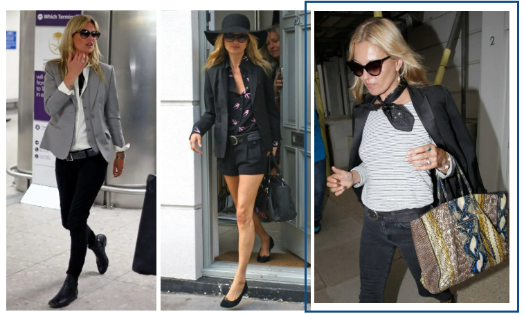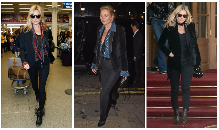 西装、开衫、衬衫、T恤、飘带、围巾、印花…这些在我们看来选两三件组合在一起就足够用的元素,却可以同时出现在Kate Moss身上。