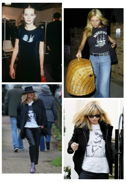 不光这些大件,拥有叛逆摇滚魂的Kate Moss在细节上也有体现。最直观的像图案T,从少女时期就在穿,到现在也是挚爱: