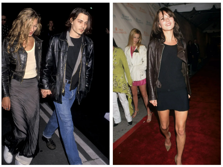 叛逆青年还不爱大廓形,他们的衣服裤子都是合身的。Kate Moss显然也把这点发扬光大了。她穿的机车皮衣版型合身,装饰着硬朗的金属扣,帅气极了: