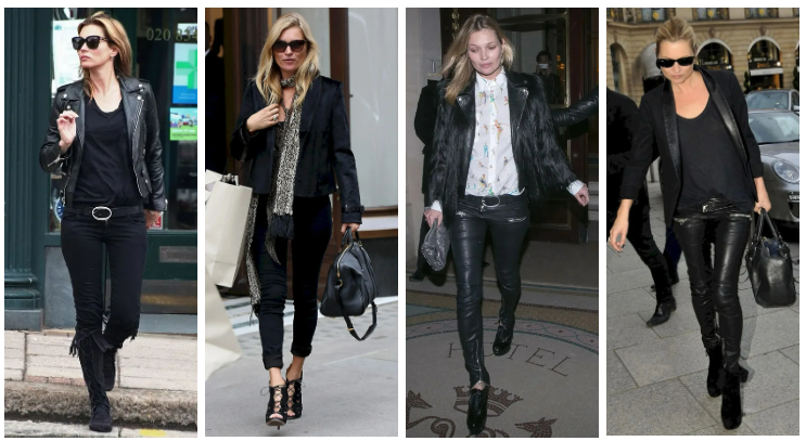 摇滚青年挚爱的合身裤子,也被Kate Moss一脉相承。还记得十年前咱人手N条的铅笔裤吗,那多少受了些大魔王的影响。All black到底,酷极了!