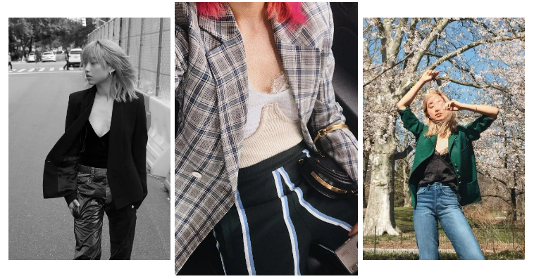 想要女人味?试试在西装里面穿吊带、bodysuit或我们之前写过的胸衣。