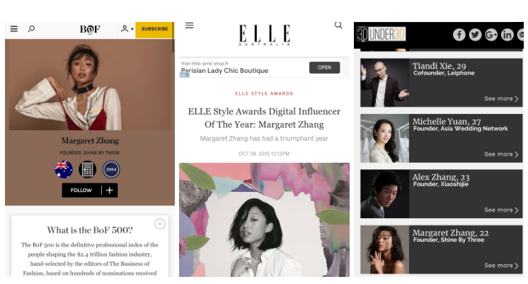 2015年,ELLE更是提名她为年度数码传播影响者。一年后,年仅23岁的她又入选福布斯亚洲30名30岁以下精英榜。