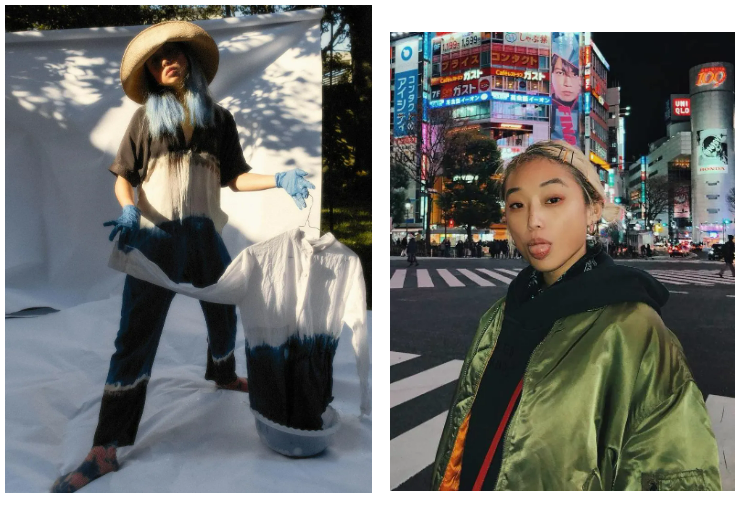 自己浸染衣服、淘vintage。右边这件写着她名字的绿外套是她在涩谷cat street里找到的。