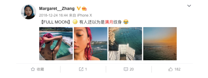 她就是我们平常会遇见的小女生,会用图和文字记录下一切。调侃自己去拔罐的痕迹被错认成是满月文身。来自东方的神秘力量,哈哈~