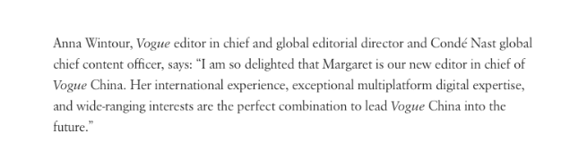 Anna Wintour也毫不掩饰对她的欣赏:“章凝的国际经验、卓越的多平台数字专业知识和广泛的兴趣爱好使她成为引领《Vogue服饰与美容》走向未来的绝佳人选。”