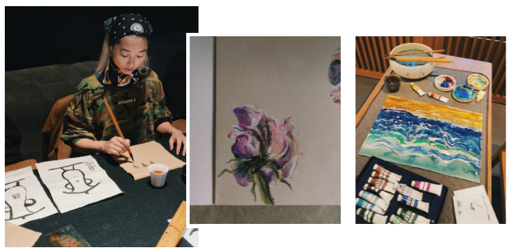她永远都保有一颗好奇心,什么都想去尝试。比如画画和写毛笔字。中间的粉彩画是她看到房间里正在干枯的玫瑰后的即兴创作。