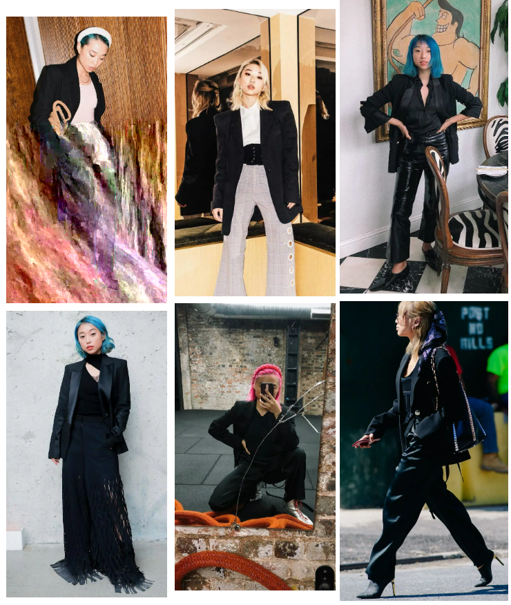 她穿过N件黑西装,all black的套路人人都可以学。秘诀就是:尽量不要选紧身的裤子。有垂坠感的裤子让整体看上去高级不少。