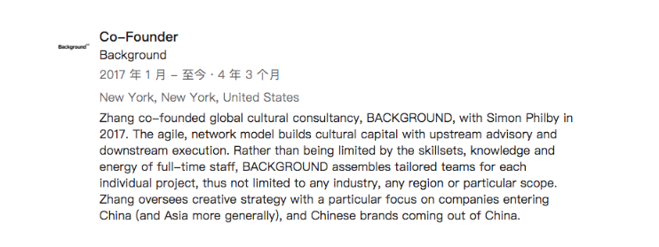 她的人生似乎永远在挑战自己。又联合创立了咨询机构Background,为国际品牌提供中西文化服务。客户包括Airbnb、YouTube和一些奢侈品牌如Mulberry Moncler。