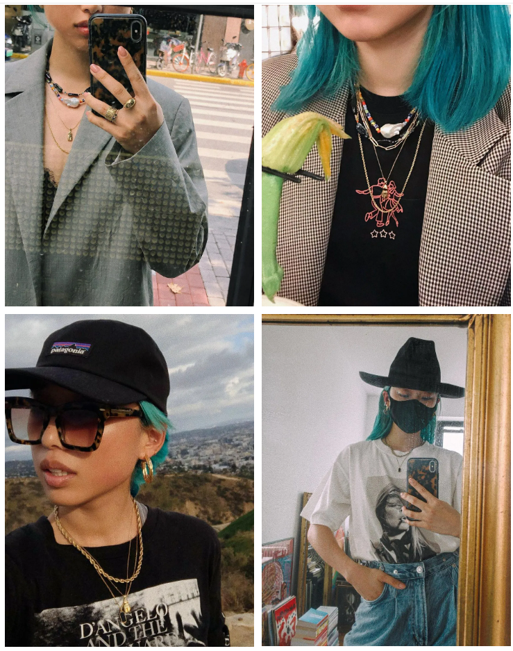 她自己也在ins上分享过,哪怕穿搭一样,饰品换了一下,感觉完全不同。她最常用的就是粗细项链混搭。