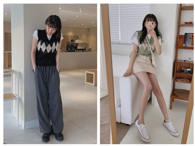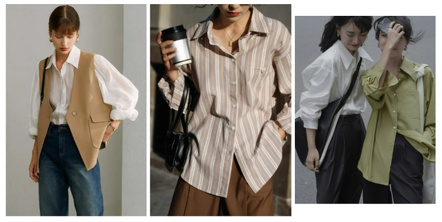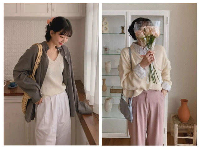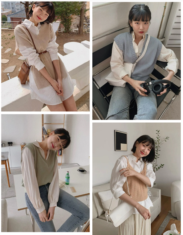 还很喜欢在衬衫外面加针织马甲。发现了吗,她的配色都是柔和的莫兰迪和蜡笔色系。谁说衬衫+马甲只能中性、帅气?其实也可以温温柔柔呀!