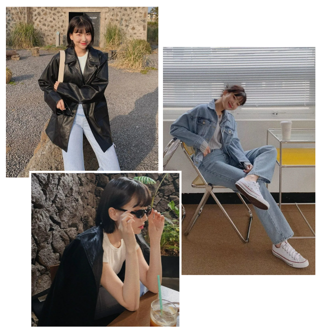 长相稚嫩、偏甜的脸型,不需要跟犀利气场死磕,加入运动休闲的感觉会更合适。呐,这拉风的皮衣、大面积的牛仔,是不是分别有点Y2K和80年代的影子~