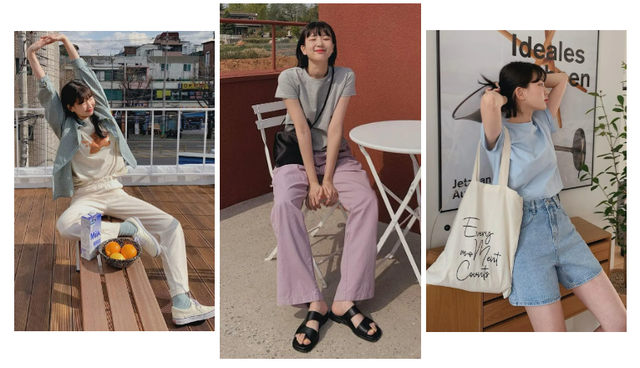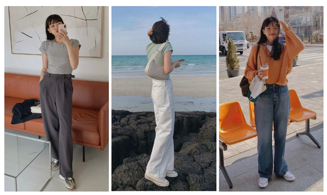要打造休闲且洒脱的感觉,阔腿裤+休闲鞋非常可!这种洒脱感是各种长裙、短裙、紧身短裤都取代不了的,对比如下图中的左和右:
