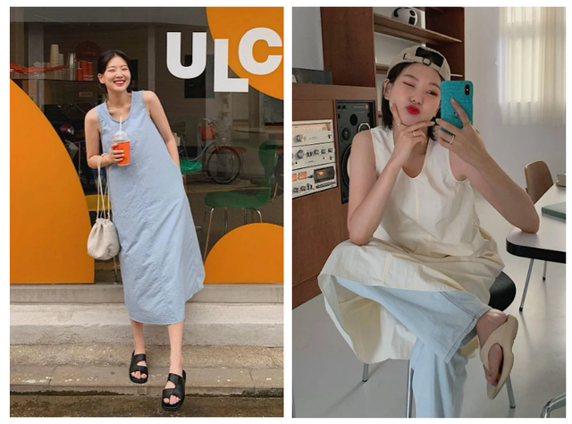 这种对比,晒过好多回。下面这组也是纯色棉质裙子,从森系到街头的转变,只需要加条裤子!