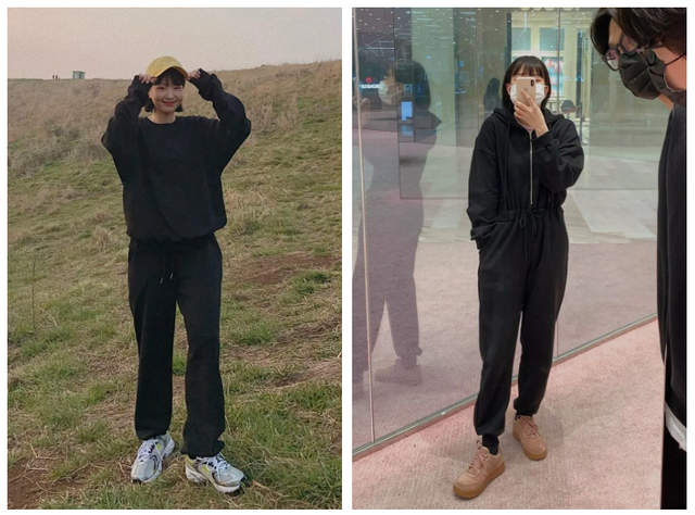 前面说深色的正式单品娃娃脸不好驾驭,但休闲单品可以啊!穿黑色运动装就甜酷甜酷的,比她穿黑色西装、OL裙要对味很多。