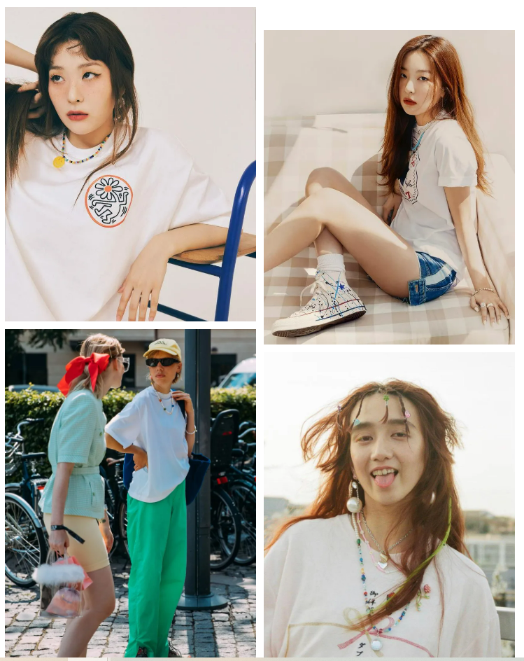 但个人最推荐的,还是串珠项链搭配白T。为原本无聊的基础单品增加一点趣味性,可可爱爱。红贝贝的姜涩琪这组好喜欢~活脱脱一个阳光小美女。