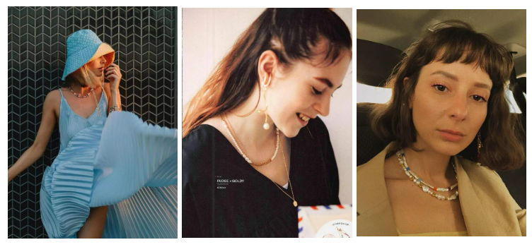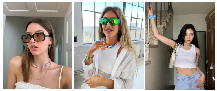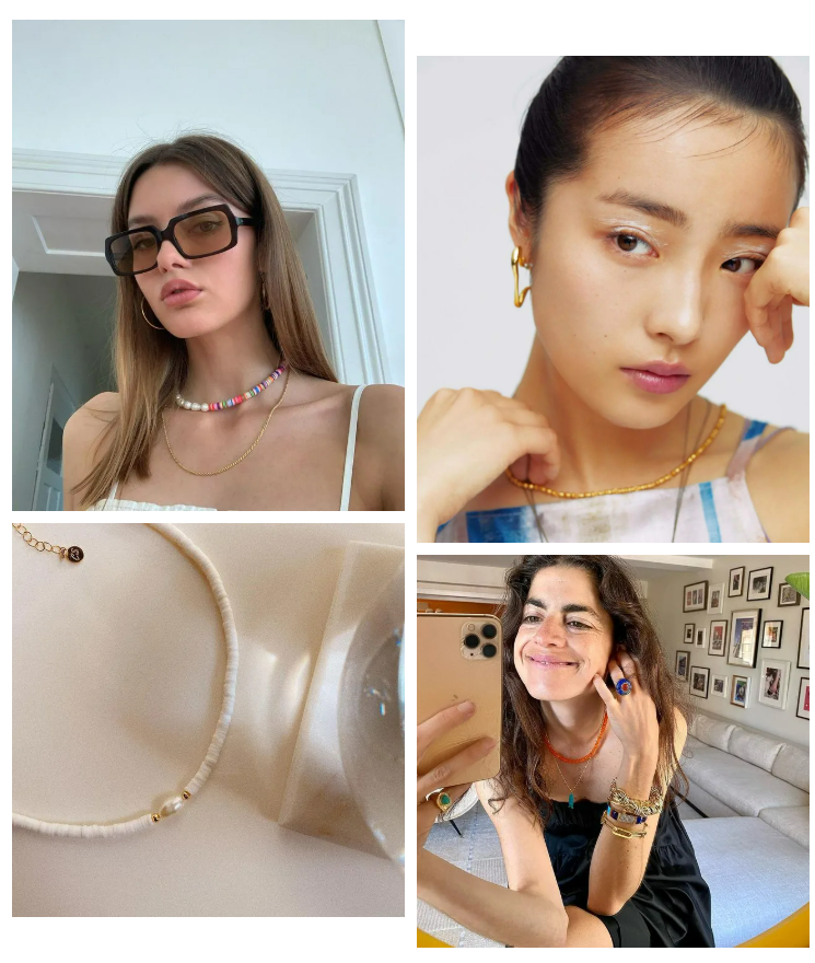 尽量避免太大的珠子,小一点的米粒珠子或纸片珠子都不错。比如日杂和烦男人博主、Mary Jean戴的这种,比较好驾驭。