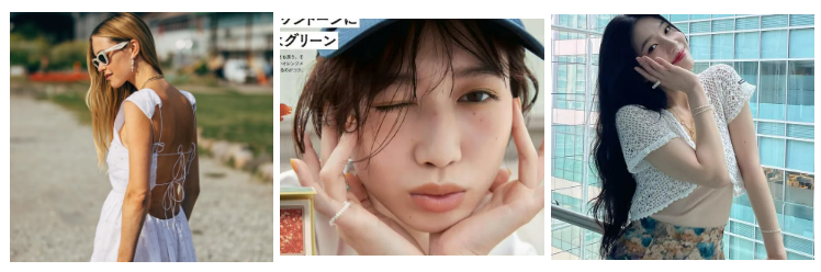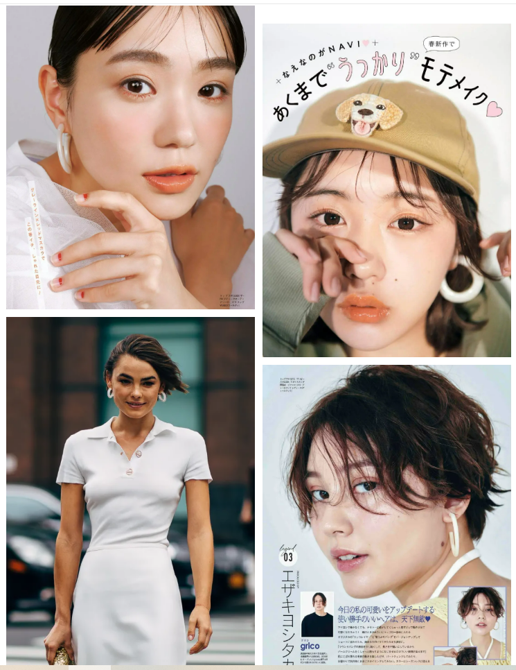 包括日杂和街拍,白色圆环耳环的出镜率都相当之高。配白衬衫、白色polo、白色吊带好干净、好度假!重点是提亮效果,超显白显气色~
