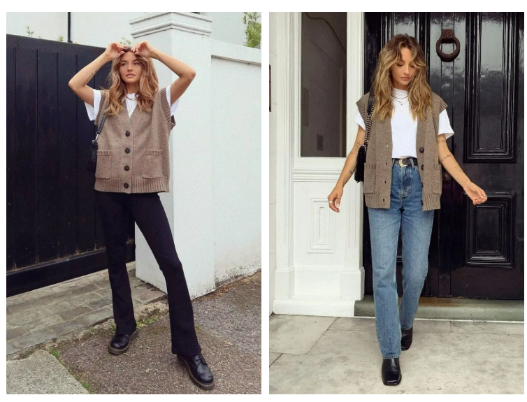 如果是带扣的马甲呢?那更好了,又回到敞开穿、扣上穿都能打造不同造型的步骤。你看,她又顺便换了两条不同的裤子,一衣多穿真的很容易实现~