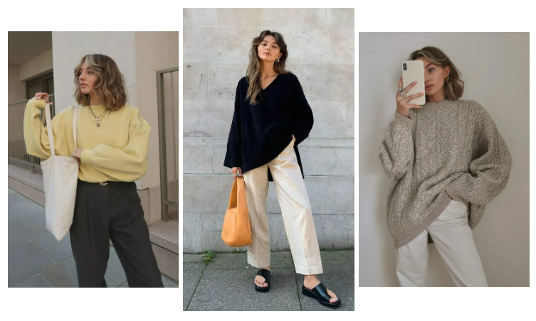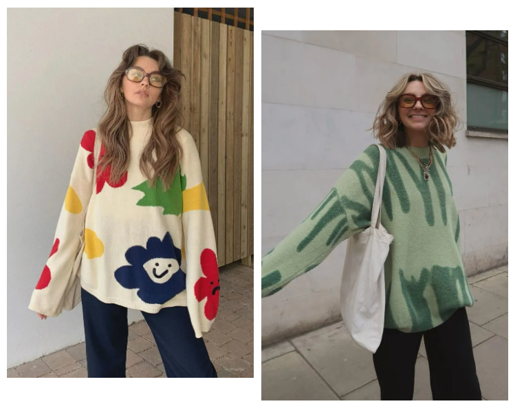 除了卡通印花,她还喜欢oversize的针织衫,一样醒目。至于搭配?当然也是一条基础直筒裤就搞定咯。