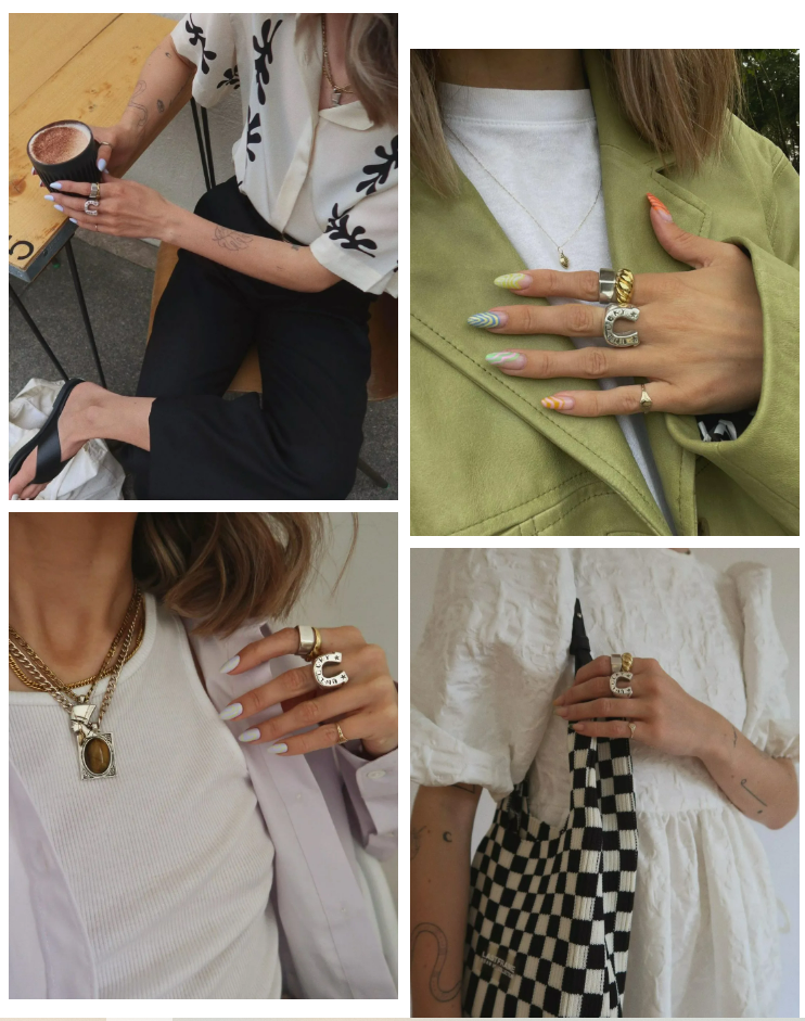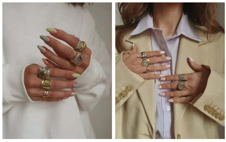 偶尔看腻了咋办?诶,想不到吧,人家还有另一套戒指。但她不是替换,而是把两只手都戴满!