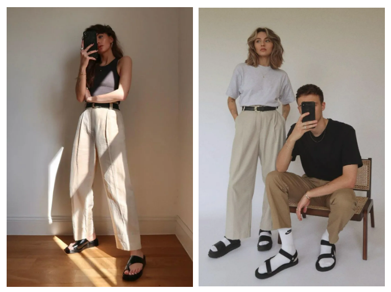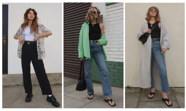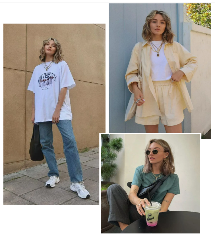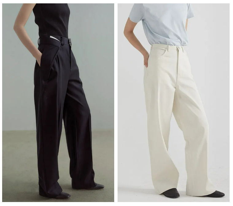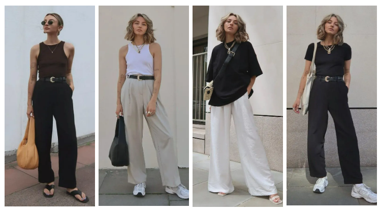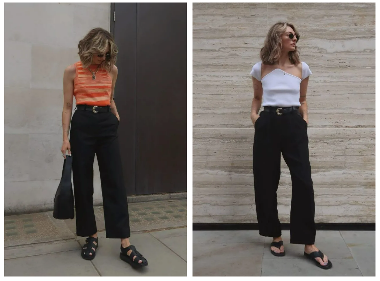 西装阔腿裤就很不错。比短裤多分秋意,比合身长裤又多分透气凉爽。Chloe最近穿最多的就是这种裤子,上面搭的都是不同版型的基础款背心、T恤。