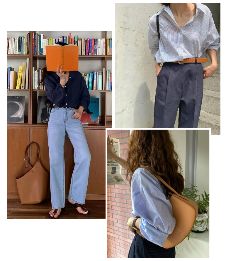 略微进阶一点,那就换成不同深浅的蓝+棕色配件,也是质感满满。