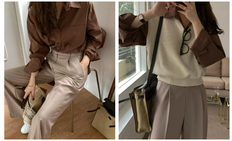或者还可以换成更暖的棕红色。喏,看她用深咖色衬衫搭浅咖色裤子,是不是好漂亮。怕老气的话就再加点白色,像右图那样套个白色马甲就不错。