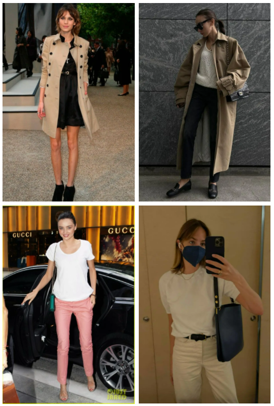 比如风衣+白色衬衫+牛仔裤这个组合,十年前你穿这个组合是正确的,十年后你穿这个组合也是正确的。关键在于这三件单品的选择。几年前市面上的风衣大多是合体的,长度在膝盖上的款式;现在市面上的风格基本以oversized为主,长度也在膝盖下居多。白色T恤也如是,几年前的纯色T恤,基本以V领、较大的圆领,收腰设计为主,现在的纯色T恤以小圆领+H版型为主。